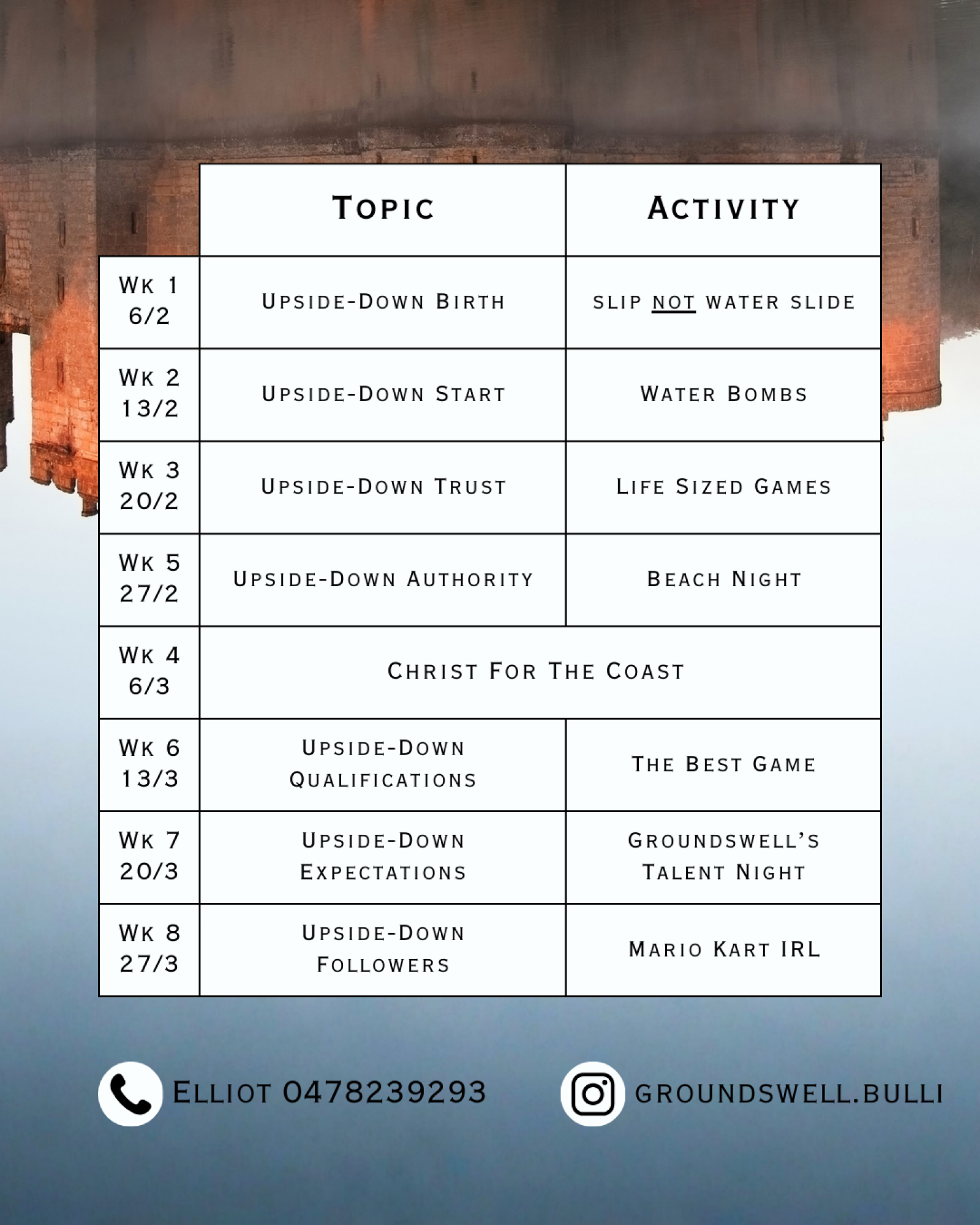 Groundswell is a community of youth who meet every Friday of school term for good times, good friends and learning more about the life Jesus offers. We get into the Bible, ask questions, talk a lot, eat a lot and laugh. We also pray, go out on adventures some nights and love to FROTH - about everything. We love it when new people come so if you are new - COME!!